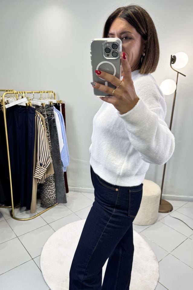 Bisiklet Yaka Yumoş Kazak Beyaz
