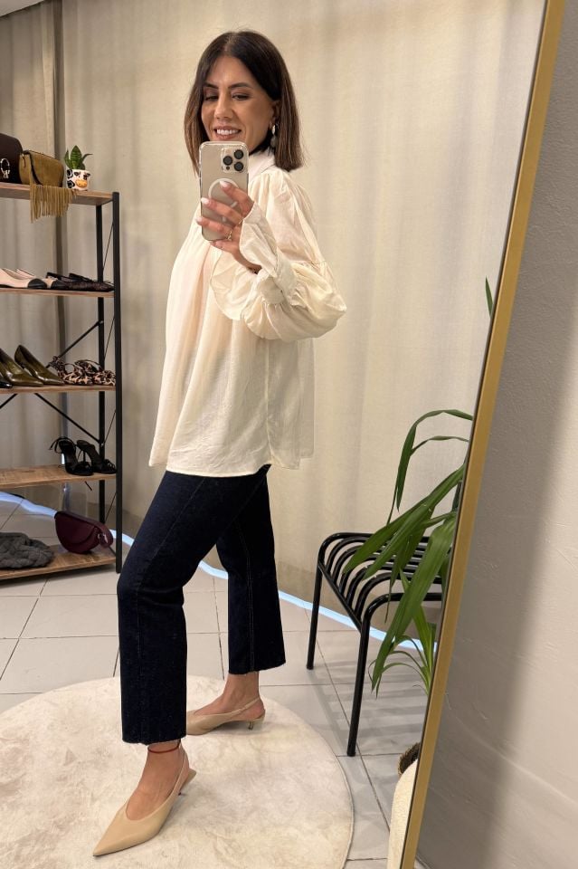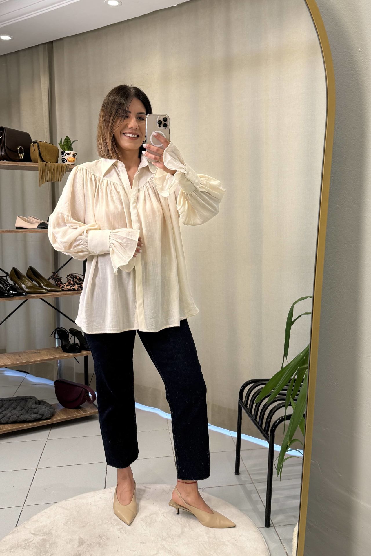 Büzgü ve Kol Detaylı Gömlek Ekru