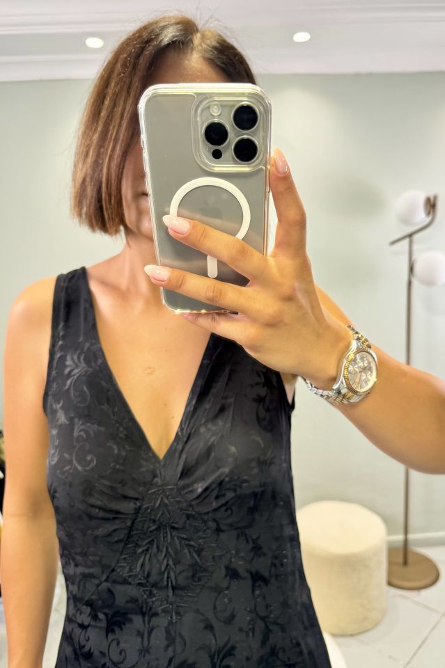 Saten V Yaka Maxi Elbise Siyah